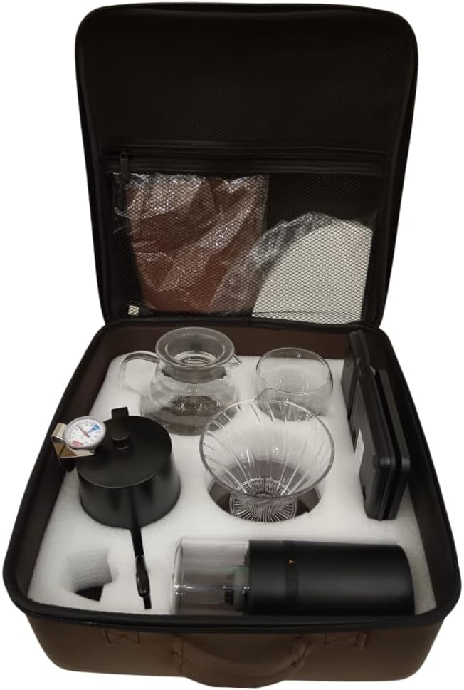 This 12-piece travel coffee gift set is the perfect companion for coffee enthusiasts on the go. The set includes a sleek goose neck kettle for precise pour-over brewing, a digital scale for accurate measurement, a double-walled glass mug to keep your beverage at the ideal temperature, a glass server for sharing, Electric Grinder for freshly ground beans, an acrylic dipper for ease of use, and 100 paper filters for convenience. The compact and durable carrying case ensures everything stays organised and protected during travel. Elevate your coffee experience with this comprehensive set, whether you're at home, the office, or on an adventure. Crafted with high-quality materials, this set offers a delightful and personalised coffee ritual wherever your journey takes you.