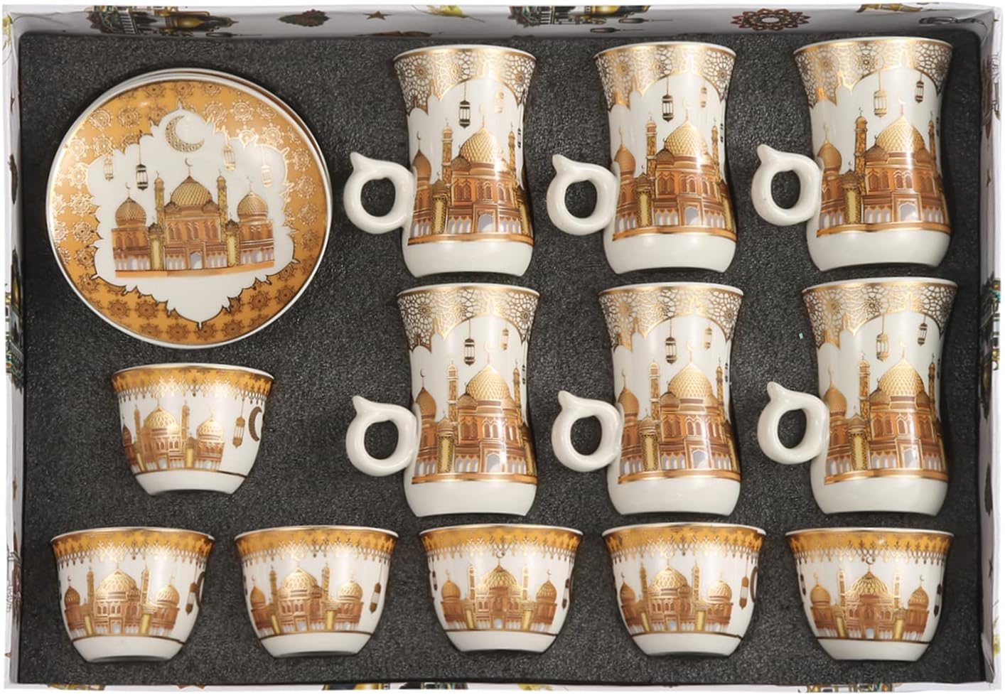 Liying 18pcs Ramadan Design Porcelain Arabic Tea cups(6) and Cawa cups(6) Set with saucer Dishwasher safe and good for Gatherings, Wedding, Parties