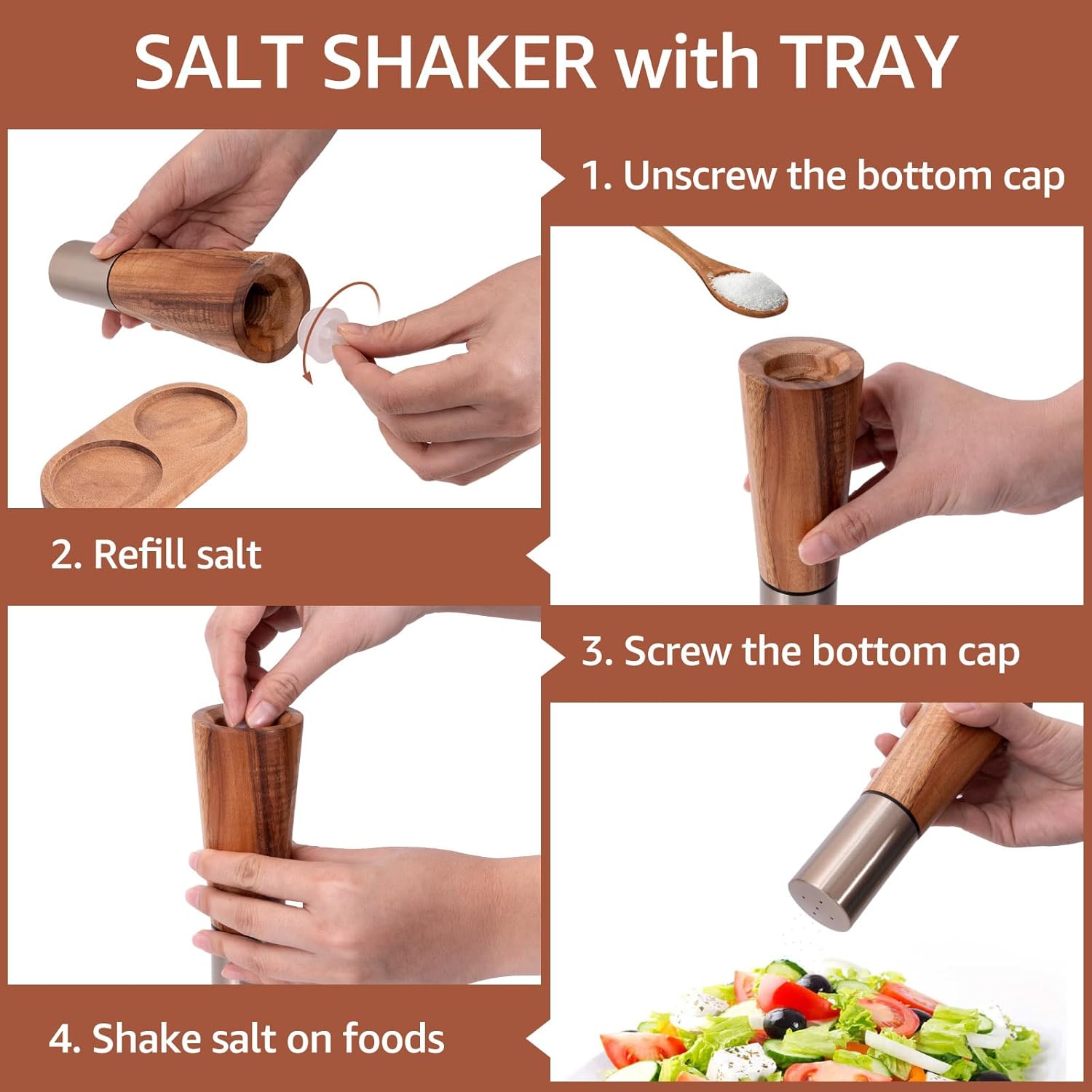 - Easy to Clean: Simply wipe with a damp cloth to clean the exterior of the acacia wood body of the salt shaker and the pepper grinder, while the stainless steel lid can be easily removed for thorough cleaning.
